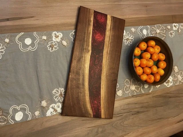 Categories: All Cheese Slicers Cutting Board 12" x 16" Lg Specialty Cutting Boards Charcuterie Boards Lazy Susans Epoxy River Boards Serving Trays Misc. All / Burgundy Epoxy River Board Serving Tray, 12" x 22" Black Walnut $120.00